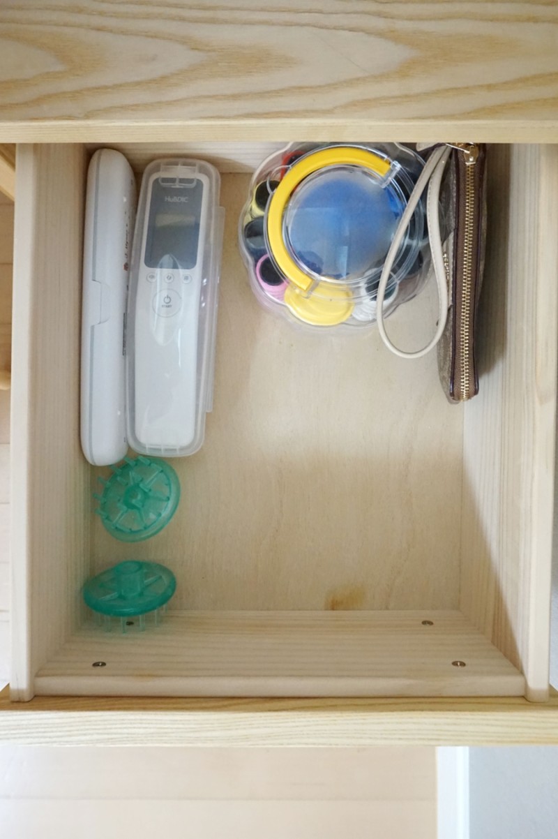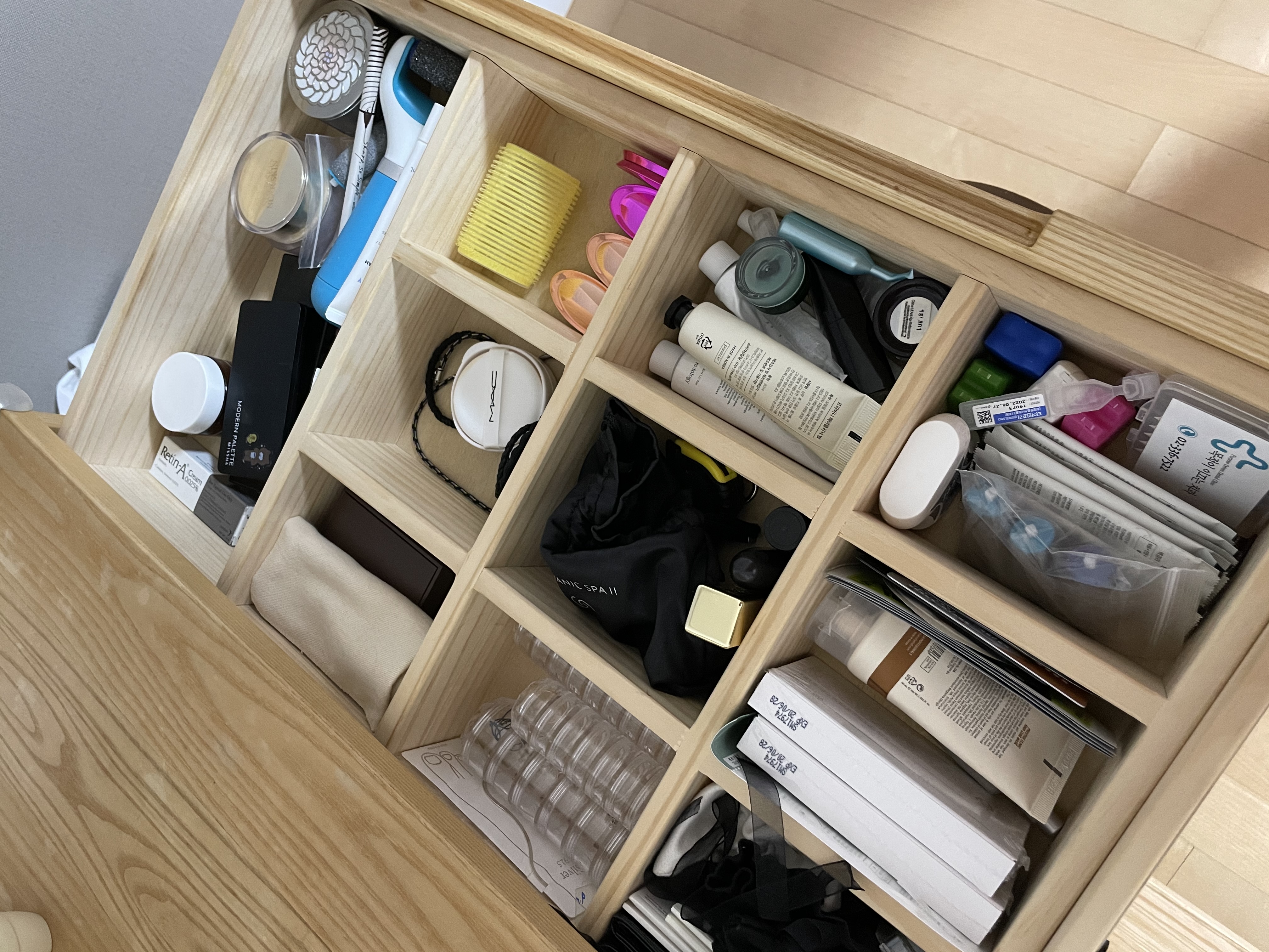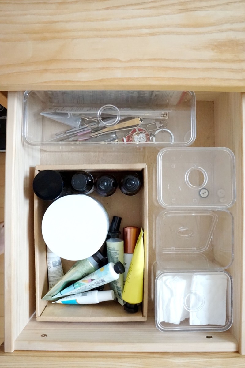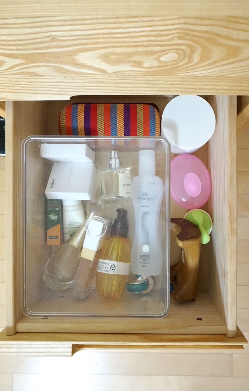 스킨케어 제품과 악세사리 보관하고 있어요.
