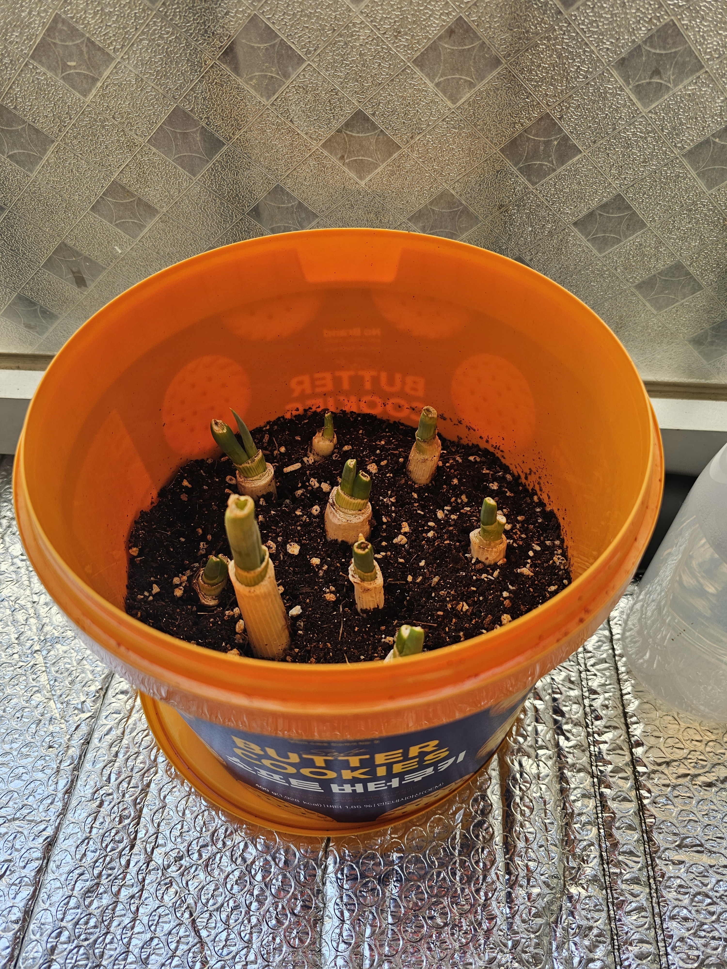 과자통으로 바닥에 구멍을 뚫어 대파를 심은지