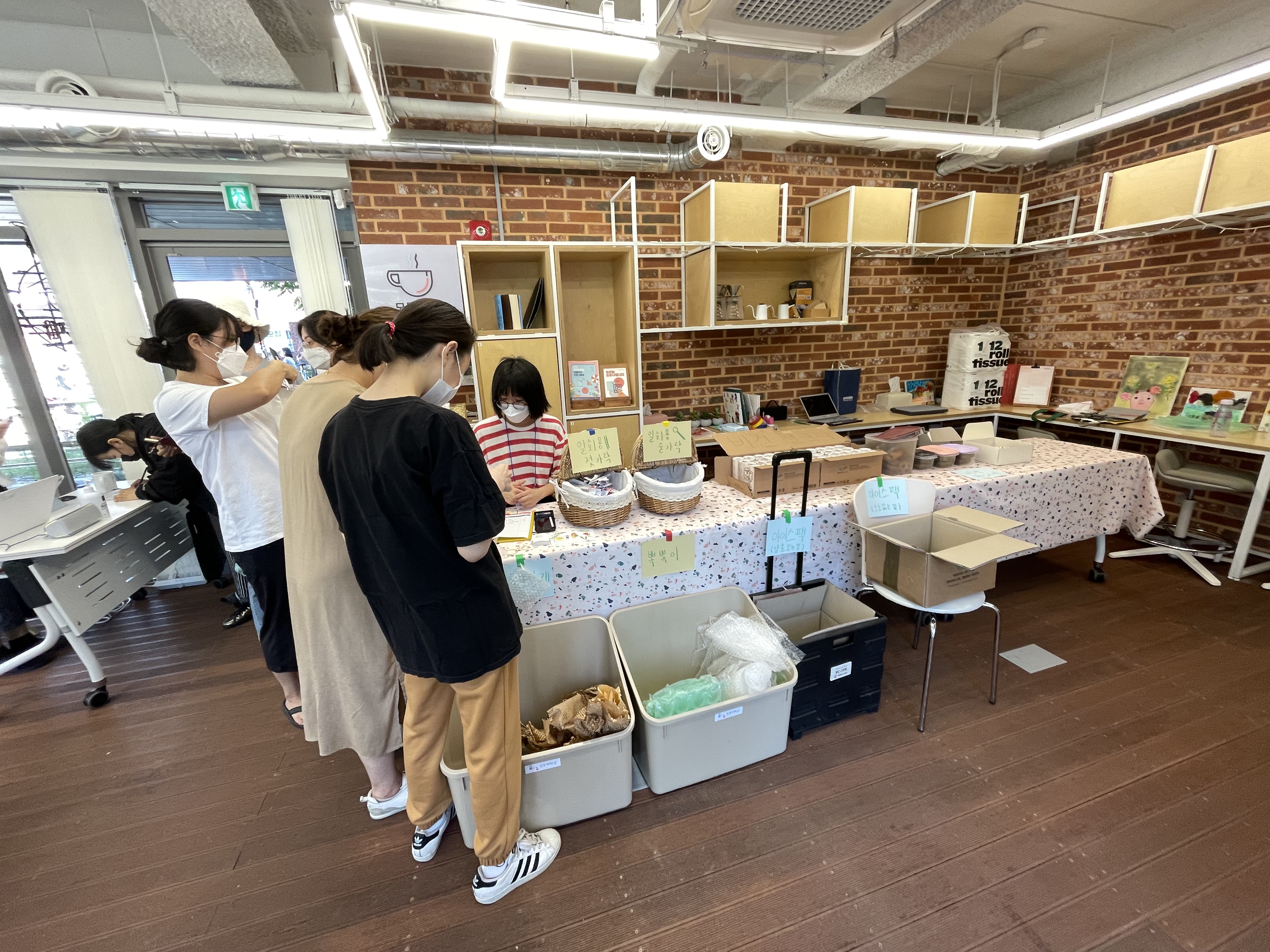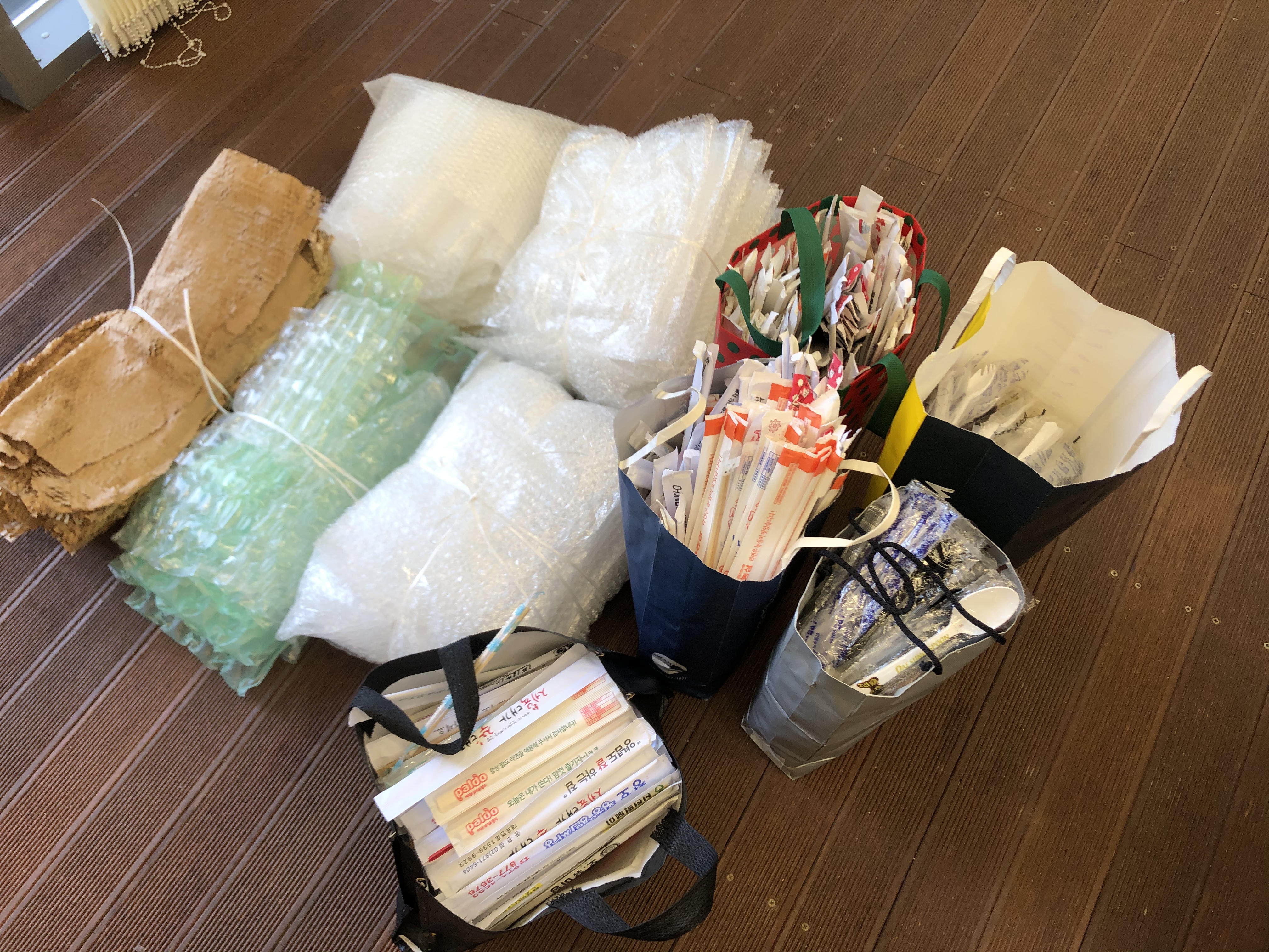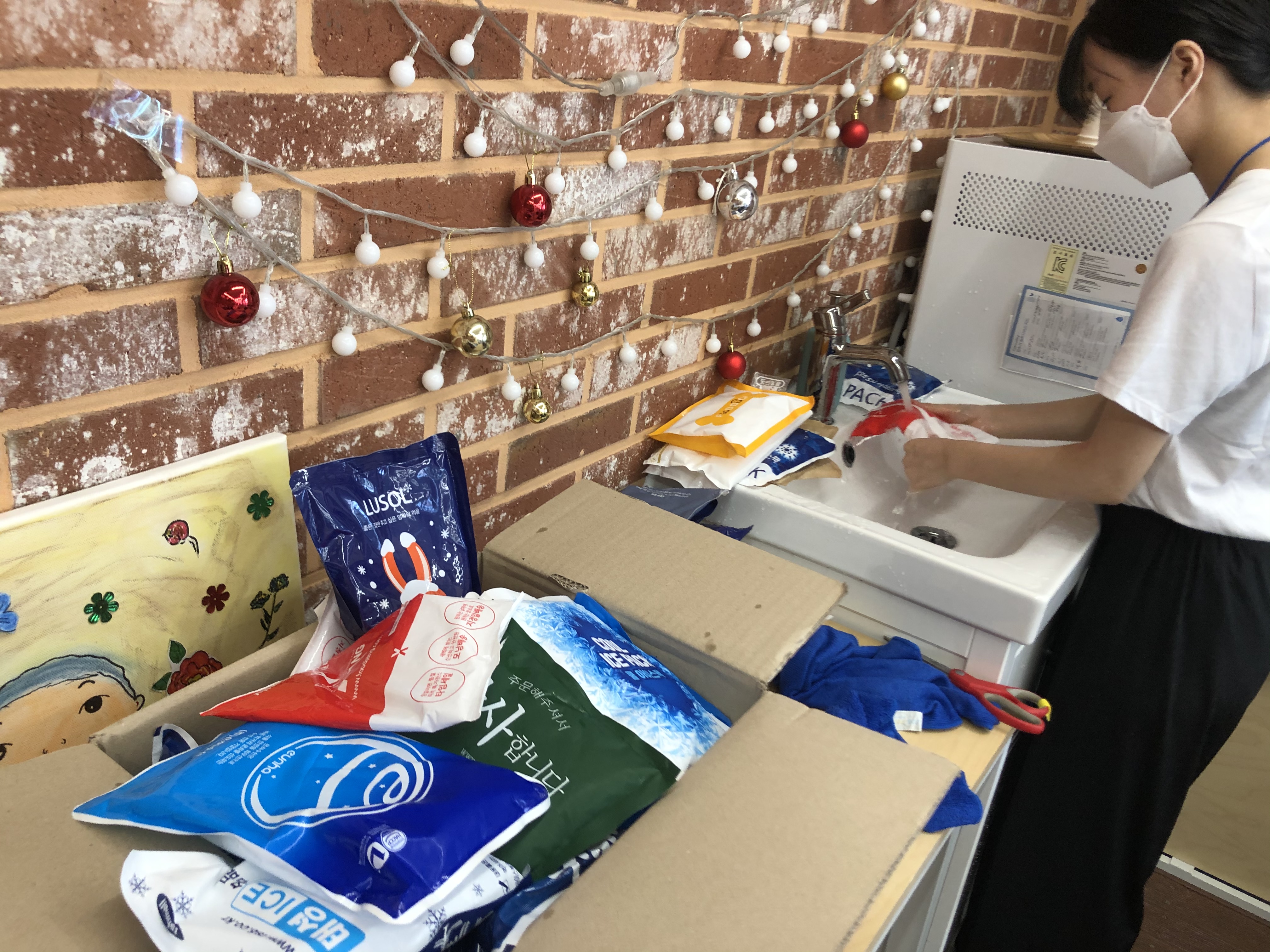 많은 시민분들이 참여해주셔서 아이스팩 수백개, 일회용 숟가락 젓가락 수천개를 모았습니다^^ 아이스팩은 근처 정육점에, 일회용젓가락은 재래시장 자영업분들께전달했어요^^ 나머지 물품은 다음주에 자영업자분게께 전달할 예정입니다