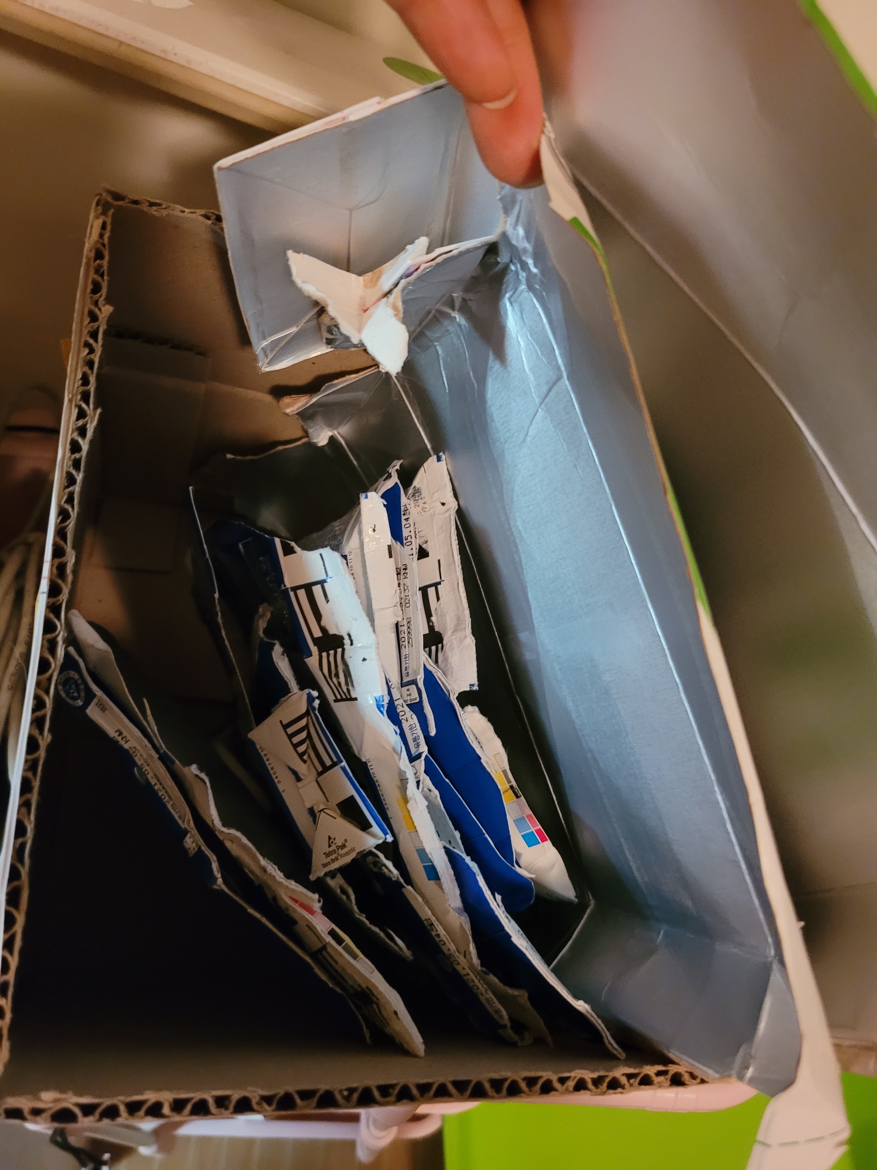 쌓여가고있는 우유팩보며