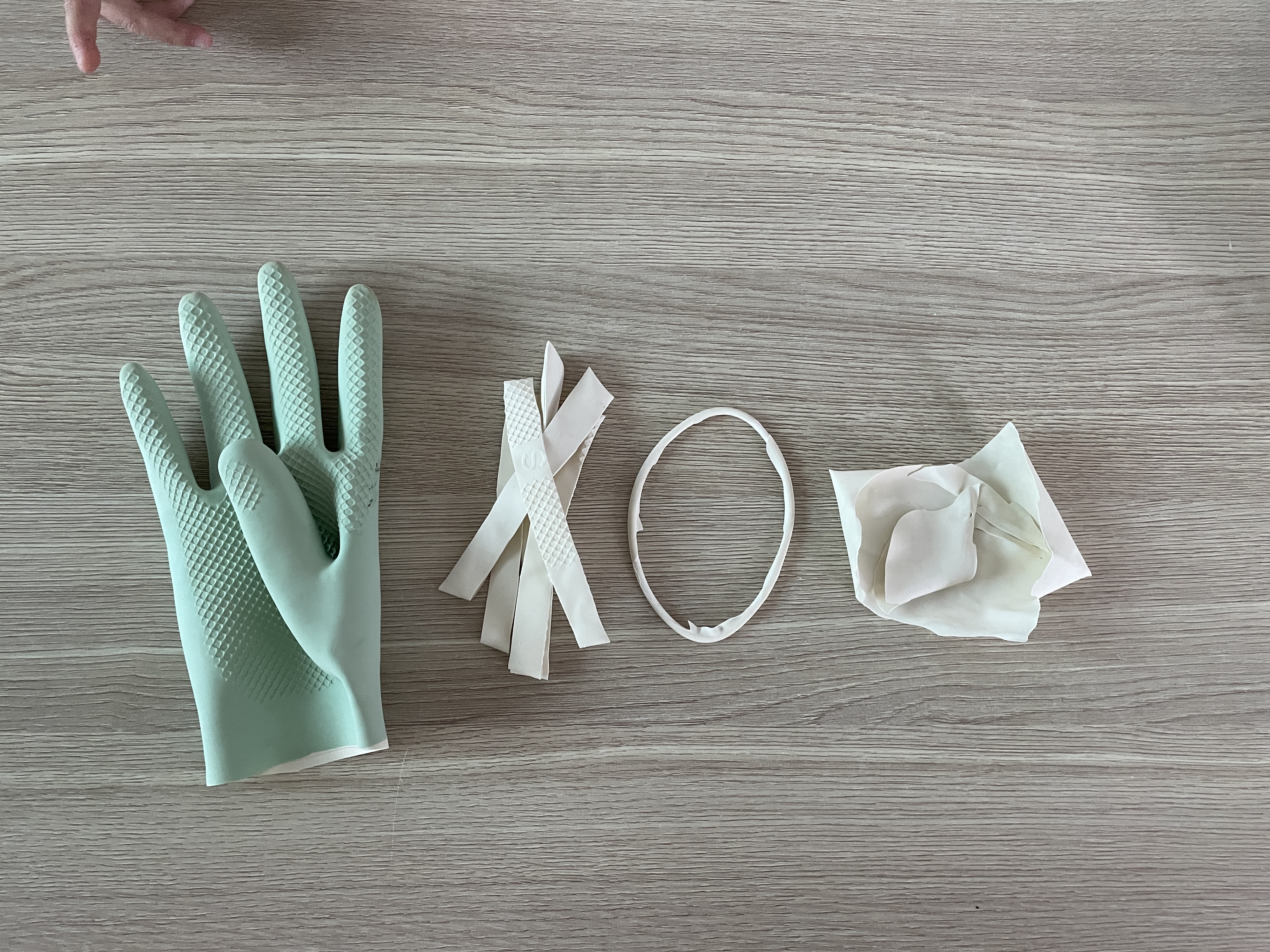 구멍난 고무장갑 버리지 않고 고무줄 대영으로 그리고이구멍이 손목쪽에 난거라 손가락쪽은 청소할때끼고하려고 잘라놨어요. 재사용의 매력!