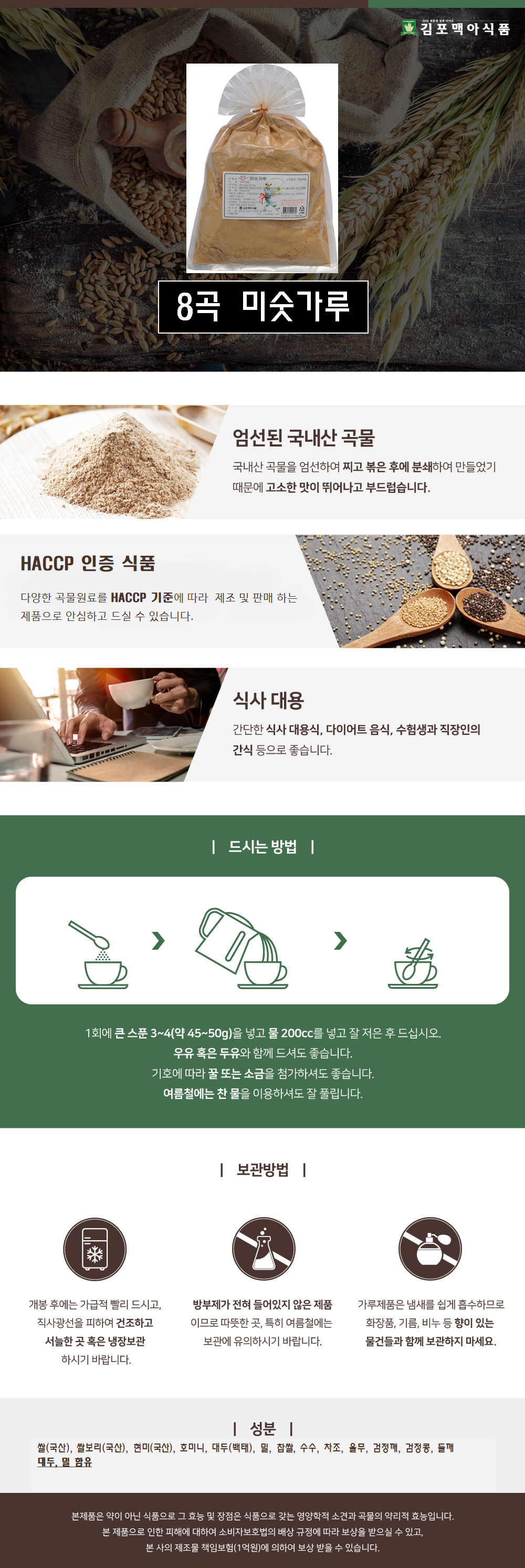 [김포맥아식품] 국내산 쌀, 쌀보리, 현미로 만든 8곡 미숫가루 1kg